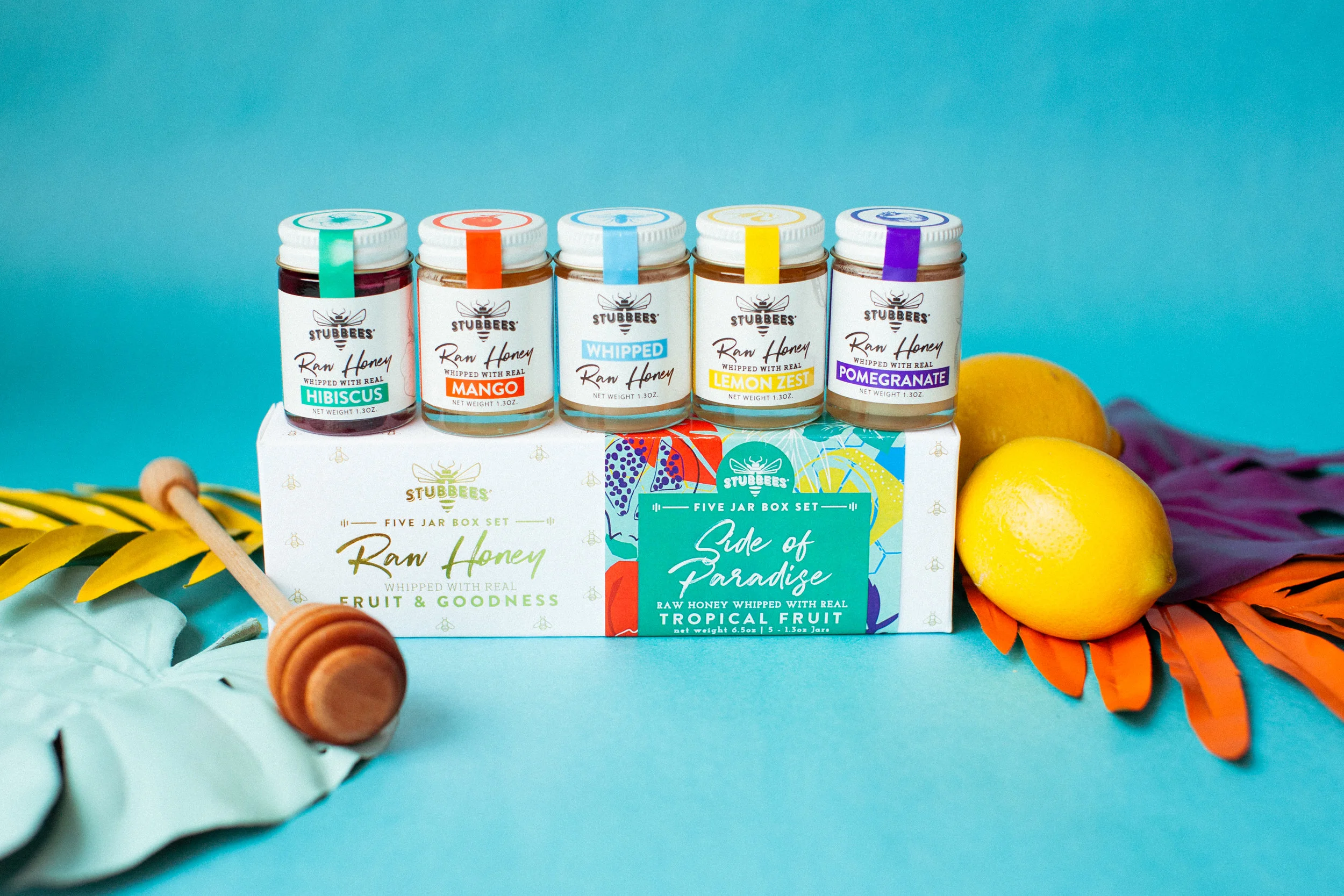 Stubbees Side of Paradise Honey Line: lineup of honey photos taken for launch of the new product while interning for SpaceCamp Co.